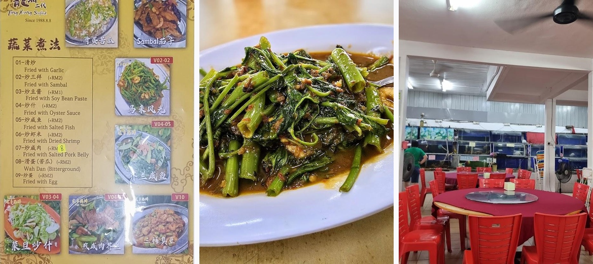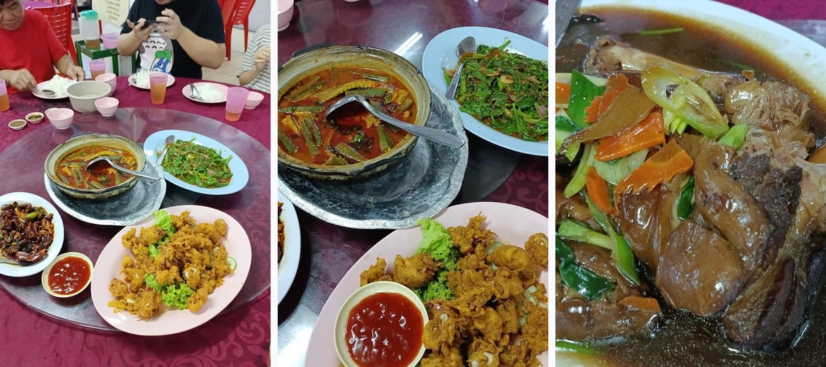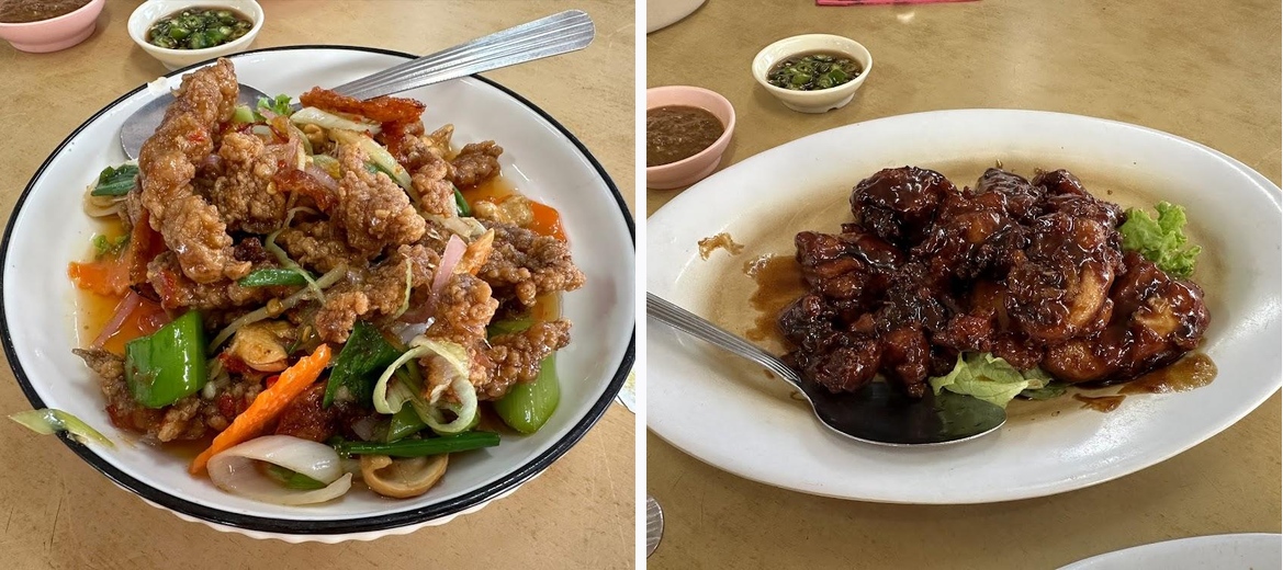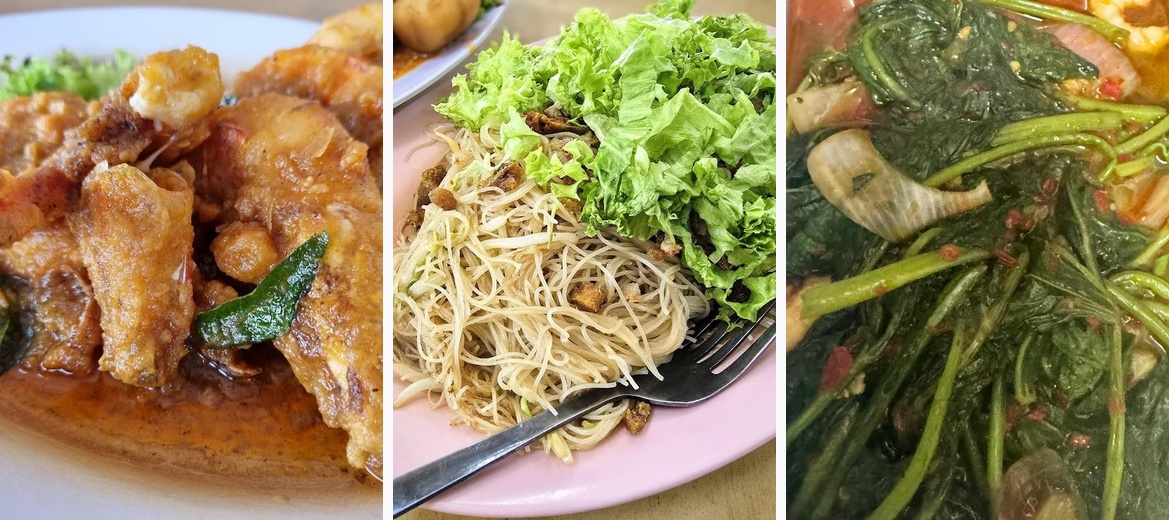 Definitely order the sambal stir-fried sweet potato leaves and kangkung. The Guinness stout chicken and Thai style mantis prawn are also top picks; they are packed with flavor and receive high praise from regulars.